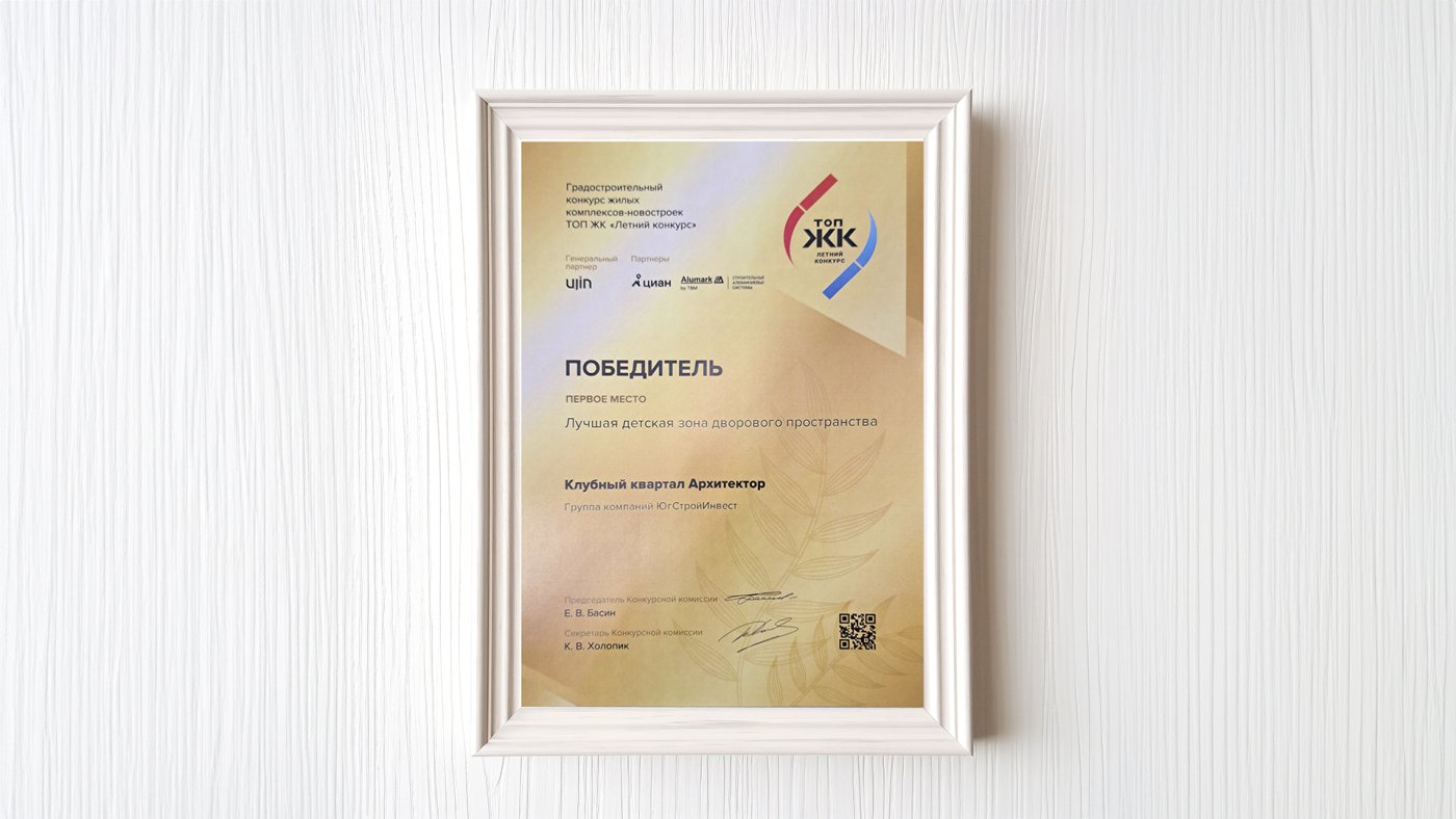 Клубный квартал «Архитектор» группы компаний «ЮгСтройИнвест» стал победителем в номинации «Лучшая детская зона дворового пространства» престижного федерального градостроительного конкурса ТОП ЖК «Летний конкурс» — самого масштабного среди жилых комплексов-новостроек в России. Награждение состоялось 14 августа в Москве.